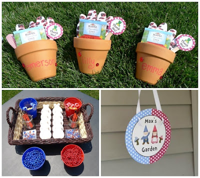 She used sand buckets throughout the party space. You can see the party favor with 5M Creations tags in the bottom right photo.